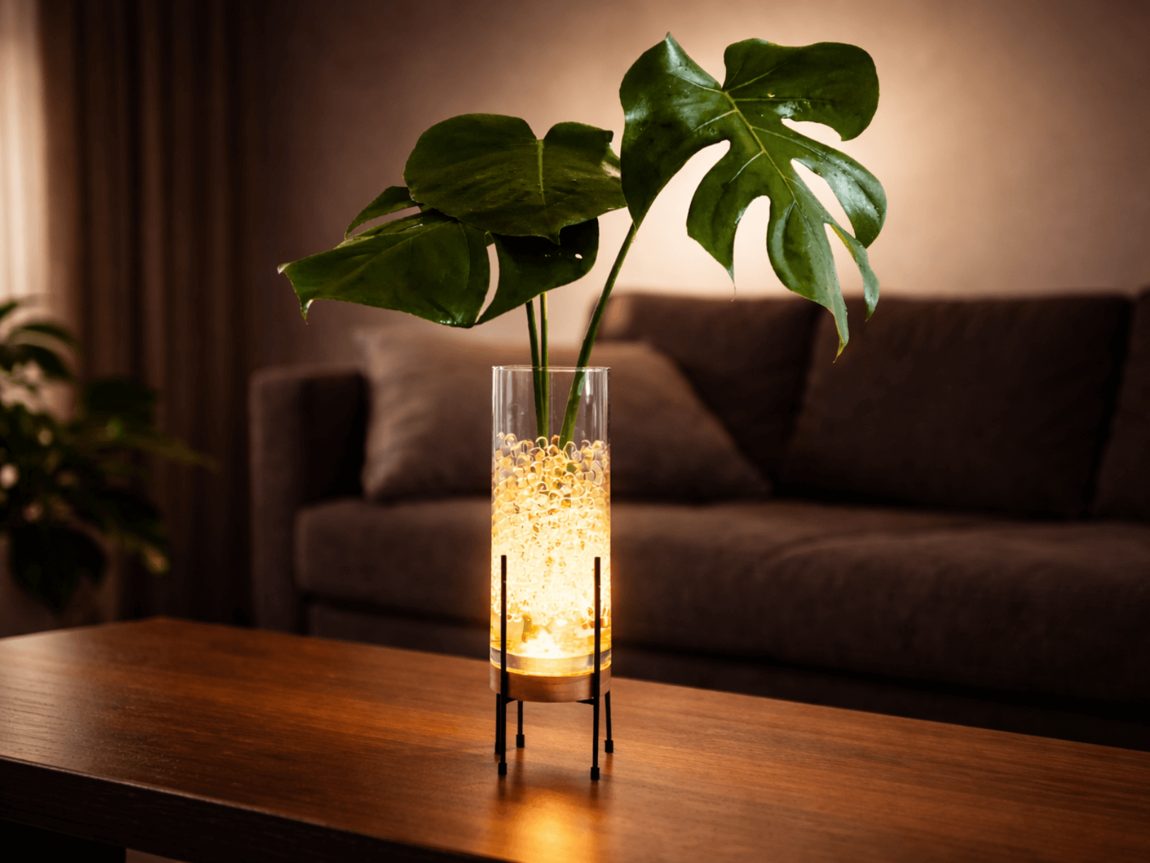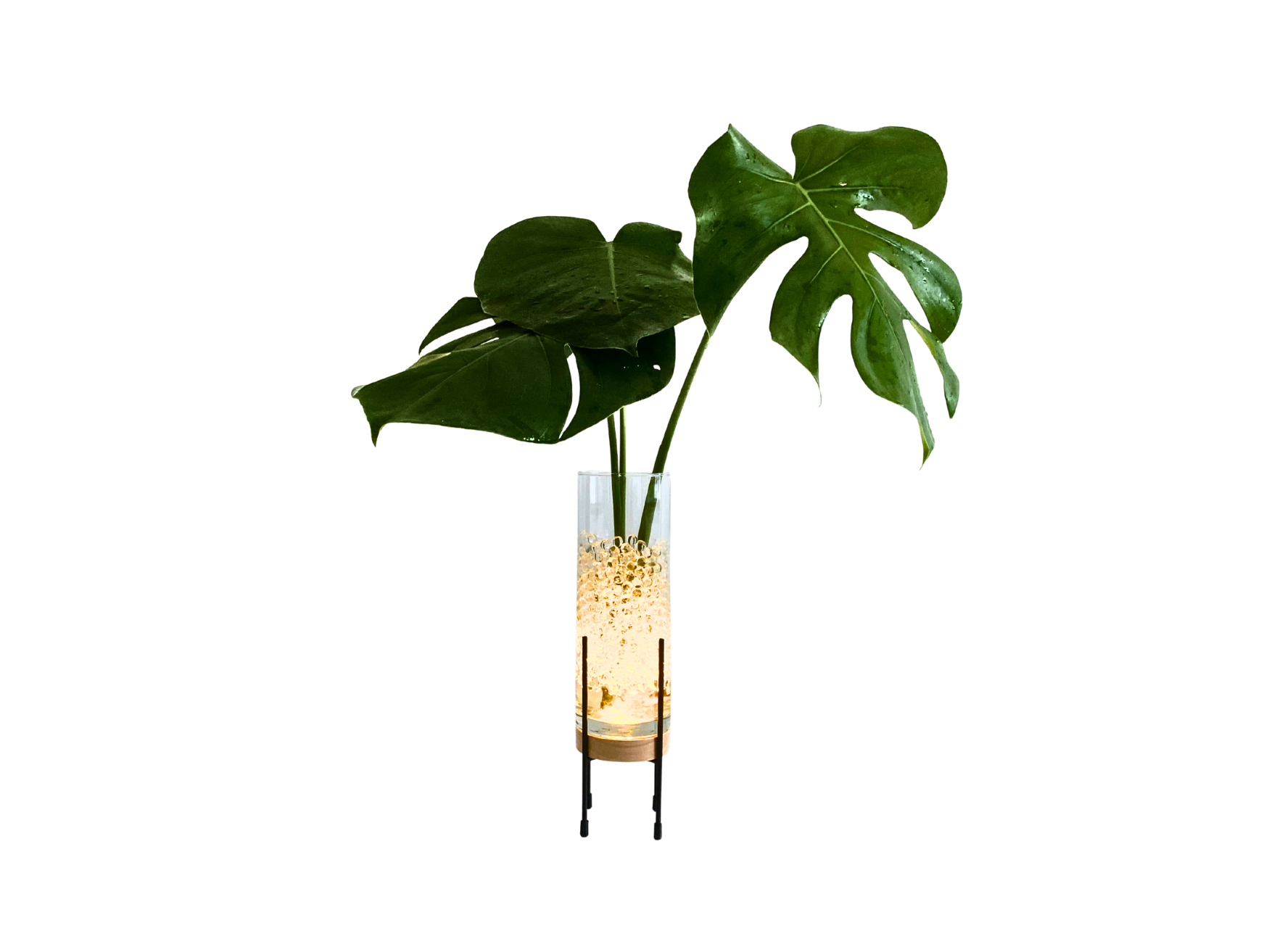 A planta natural ganha destaque em um suporte metálico sofisticado, acompanhado de uma iluminação LED suave, que valoriza o verde e cria um efeito visual único na decoração.