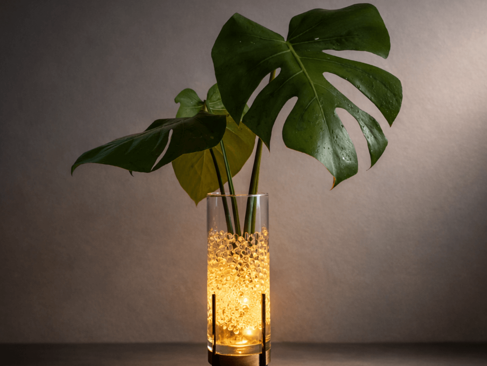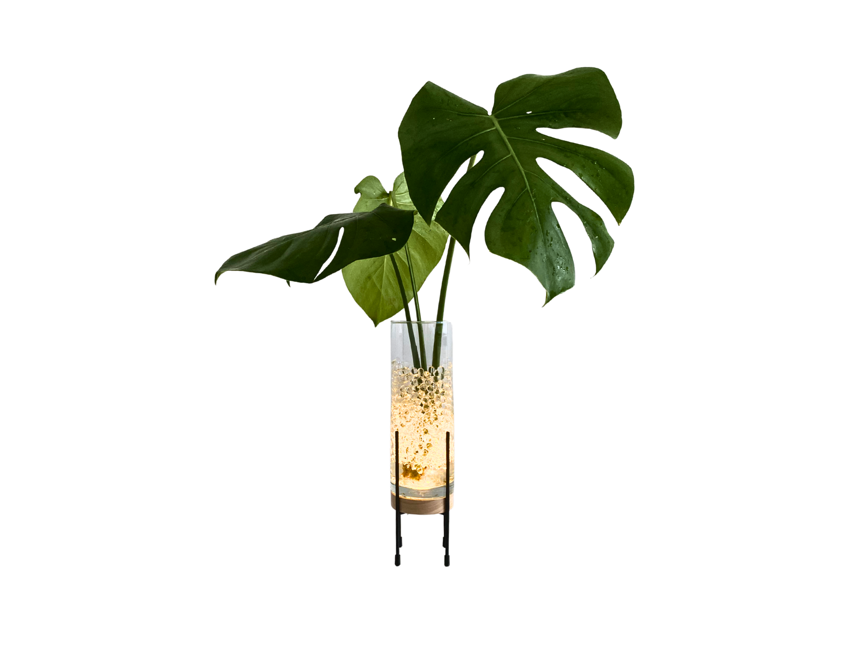 A exuberância da Costela de Adão de um jeito prático e elegante em sua casa ou escritório. Com aproximadamente 30 cm de altura, um vaso de vidro de 24 cm de altura e 9 cm de diâmetro e bolinhas em gel (5g)